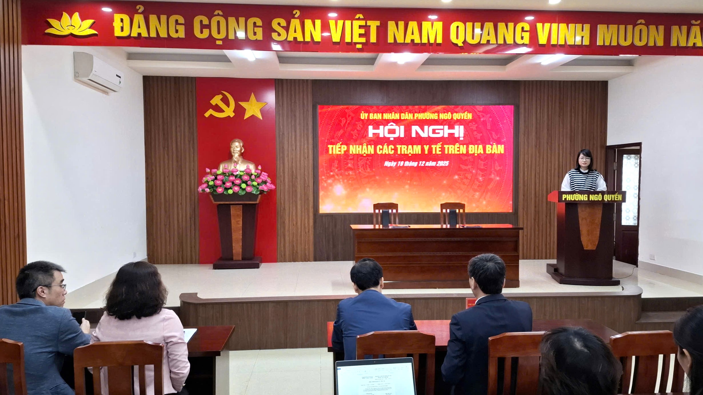 Ngày 17/12/2025, UBND Phường Ngô Quyền phối hợp Trung tâm Y tế Ngô Quyền tổ chức bàn giao, tiếp nhận các Trạm Y tế phường. Tham dự Hội nghị có ông Nguyễn Quốc Thái - Chủ tịch UBND phường; ông Nguyễn Thế Anh - Phó Chủ tịch UBND phường, Lãnh đạo và chuyên viên theo dõi các phòng, đơn vị: Trung tâm Y tế Ngô Quyền; Phòng Văn hóa - Xã hội; Kinh tế, Hạ tầng và Đô thị; Văn phòng HĐND và UBND phường; Trưởng các Trạm Y tế Phường Ngô Quyền số: 01, 02, 03, 04.