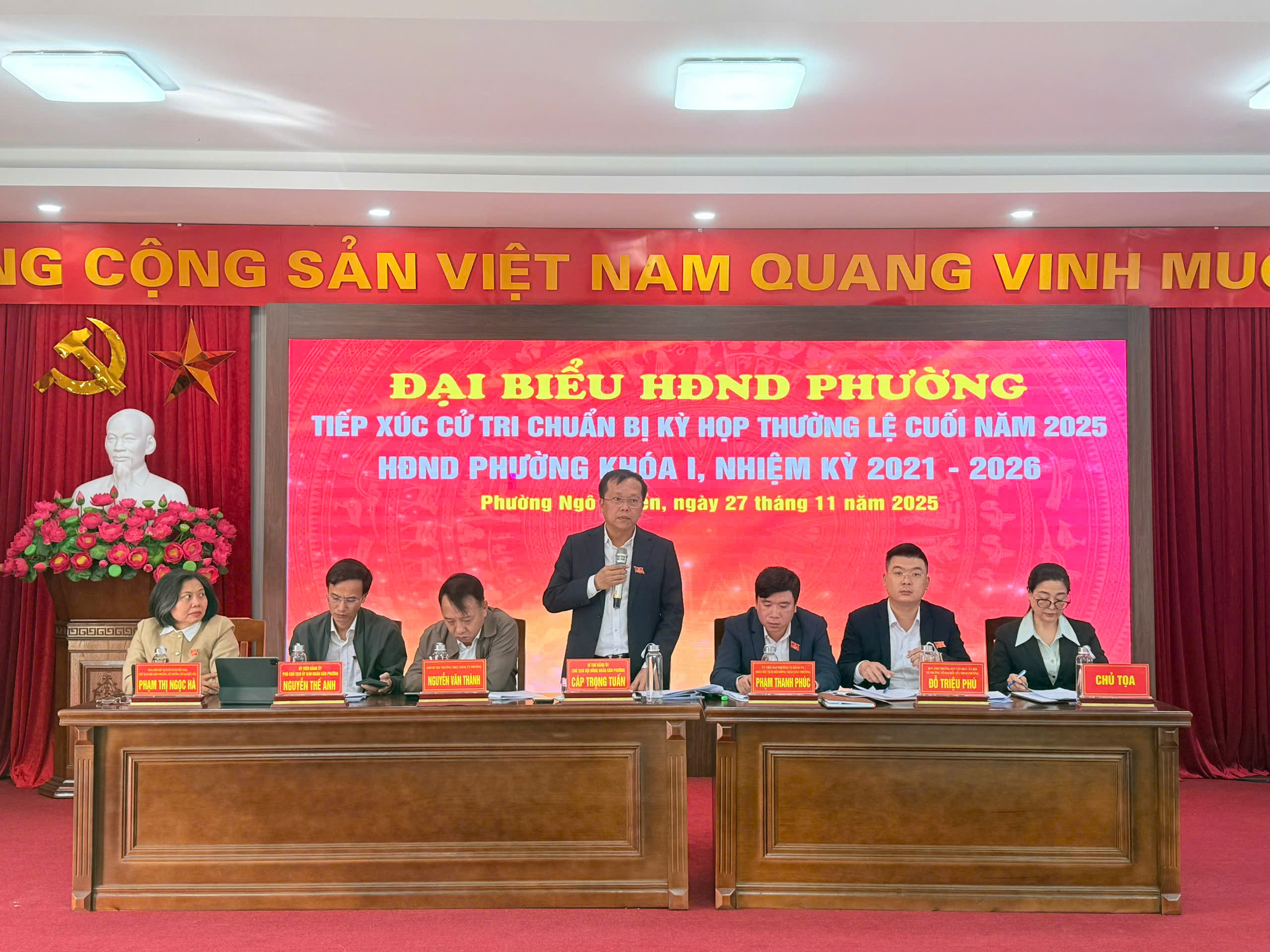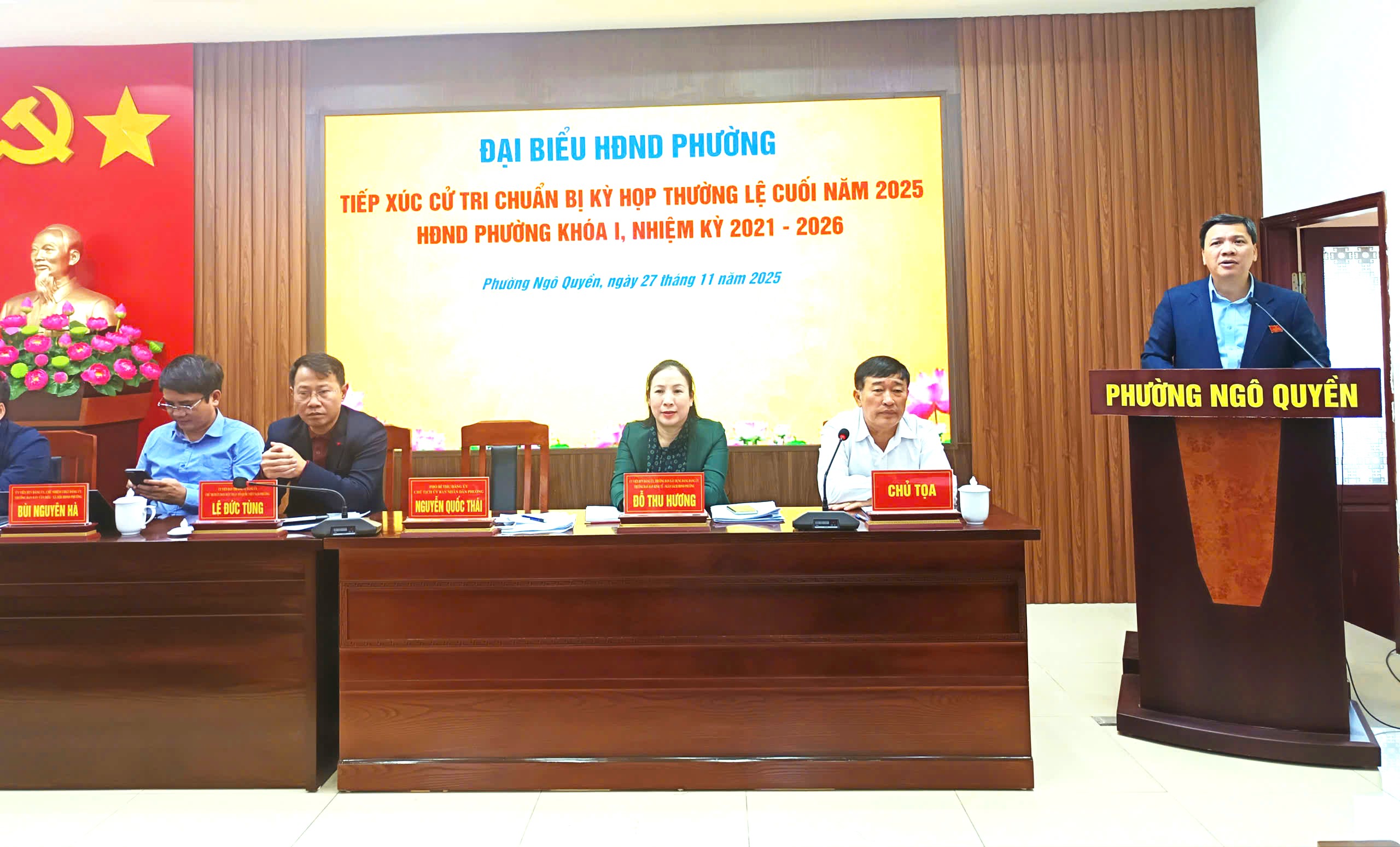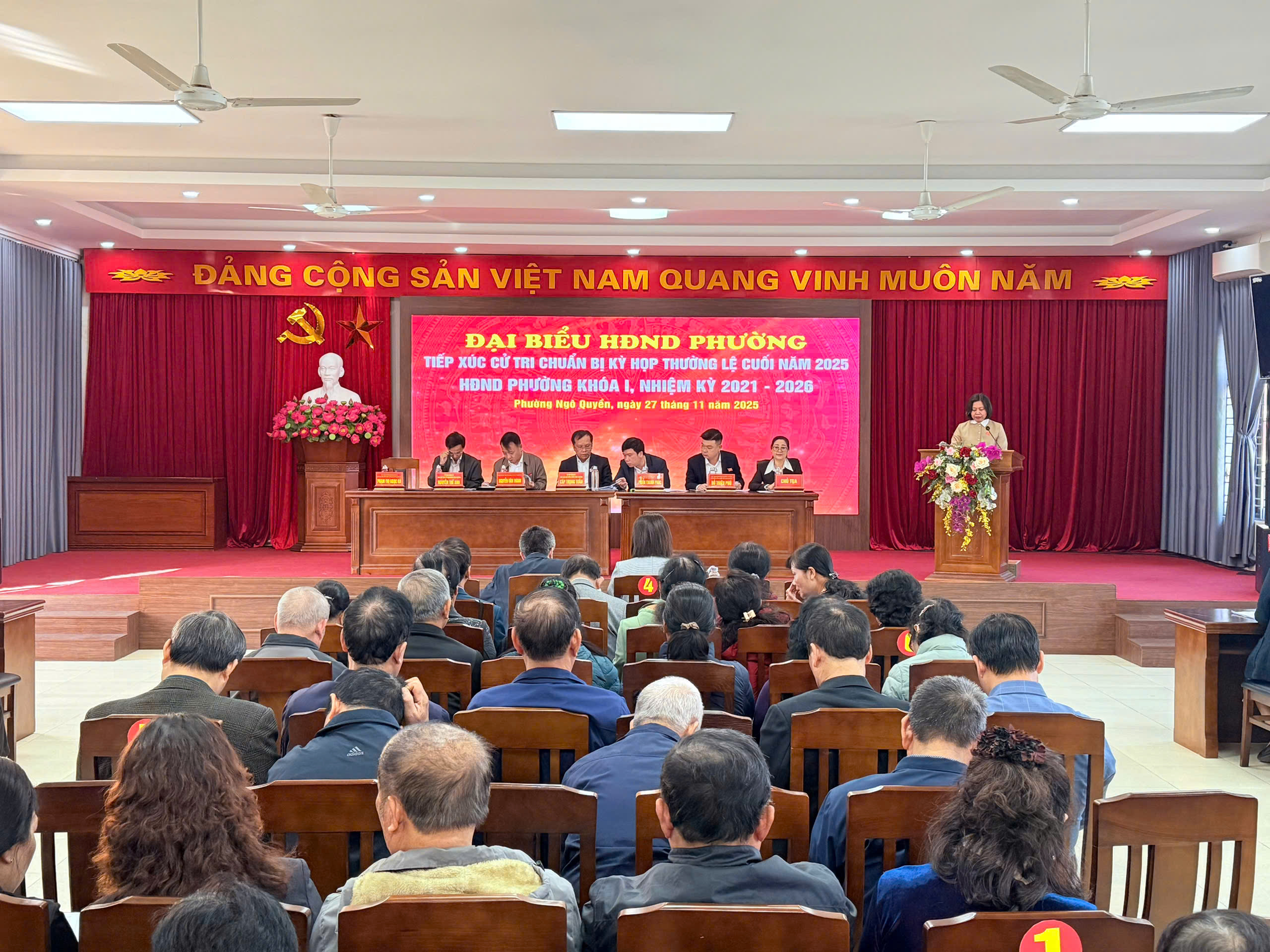 Để chuẩn bị cho Kỳ họp thường lệ cuối năm 2025 của HĐND Phường Ngô Quyền khóa I, nhiệm kỳ 2021 - 2026. Sáng ngày 27/11/2025 tại 02 địa điểm 17 Ngô Quyền và 46 Lê Lai, Phường Ngô Quyền đã tổ chức Hội nghị đại biểu HĐND phường tiếp xúc cử chi chuẩn bị Kỳ họp thường lệ cuối năm 2025. Tại hội nghị các đại biểu cử tri đã được nghe: Thông báo về chương trình, thời gian tổ chức Kỳ họp thường lệ cuối năm 2025 HĐND phường khóa I, nhiệm kỳ 2021 - 2026; Báo cáo kết quả thực hiện nhiệm vụ kinh tế - xã hội, quốc phòng - an ninh năm 2025; Mục tiêu, chỉ tiêu, nhiệm vụ và giải pháp năm 2026; Báo cáo tình hình Kế hoạch phát triển kinh tế - xã hội 5 năm 2021 - 2025, kế hoạch phát triển kinh tế - xã hội 2026 - 2030 và Báo cáo giải quyết ý kiến, kiến nghị cử tri của UBND phường.