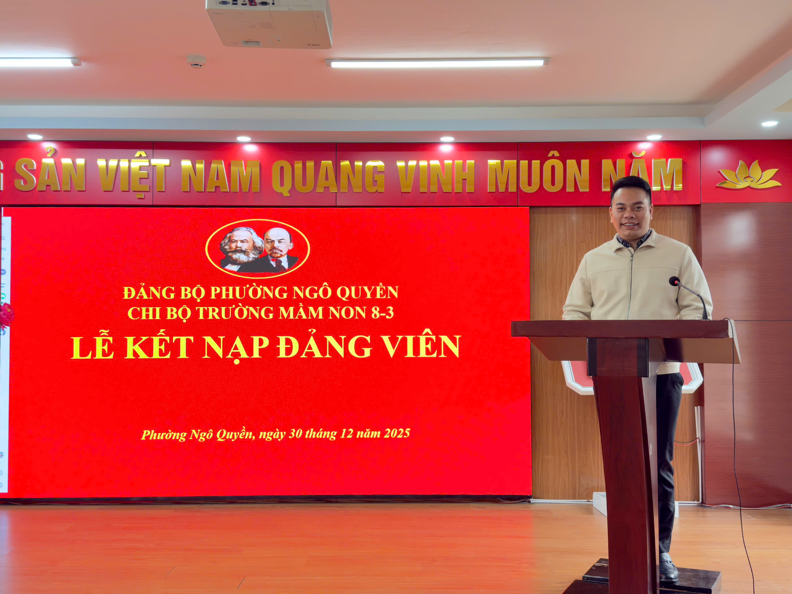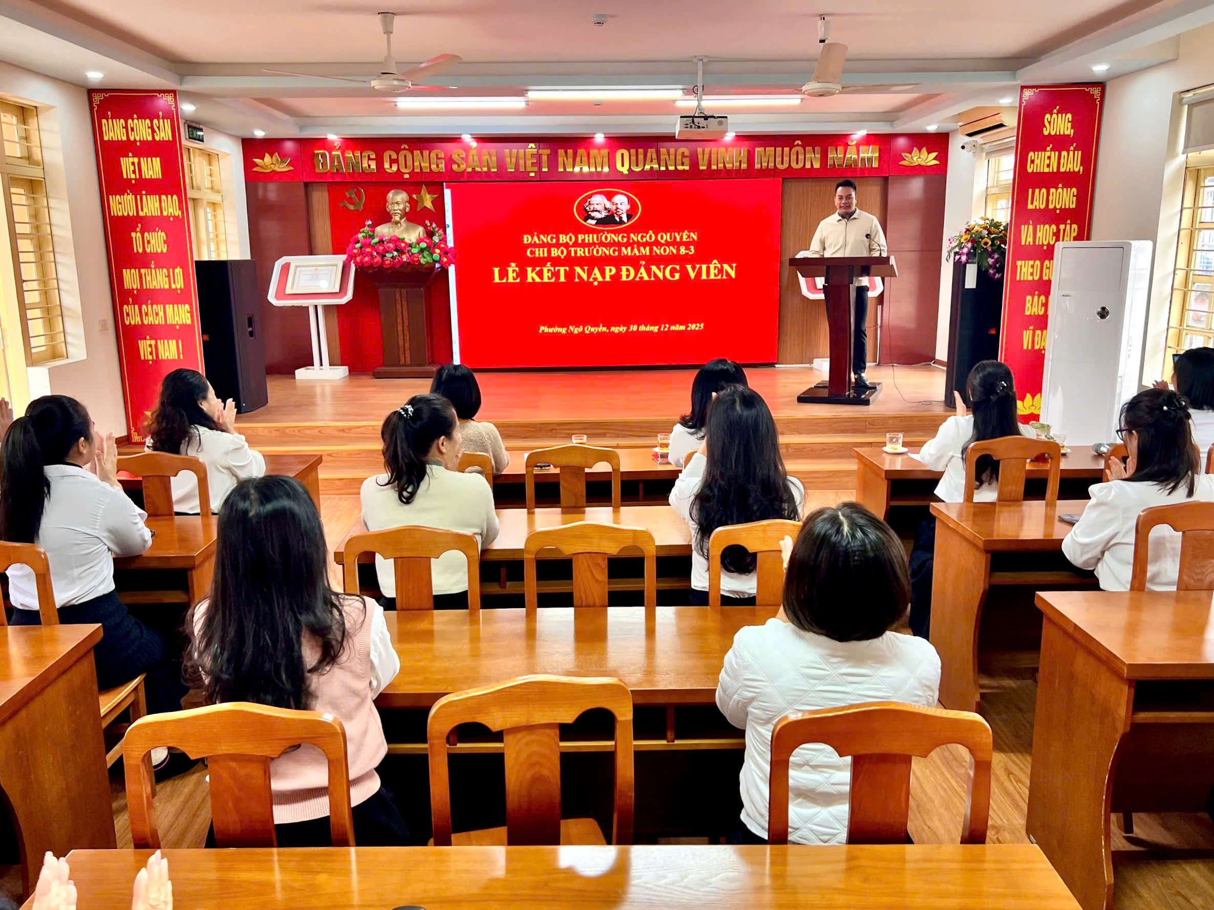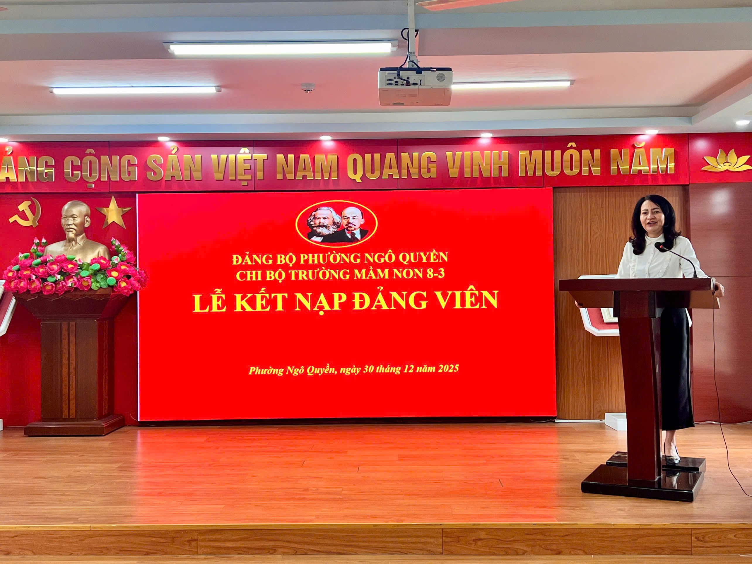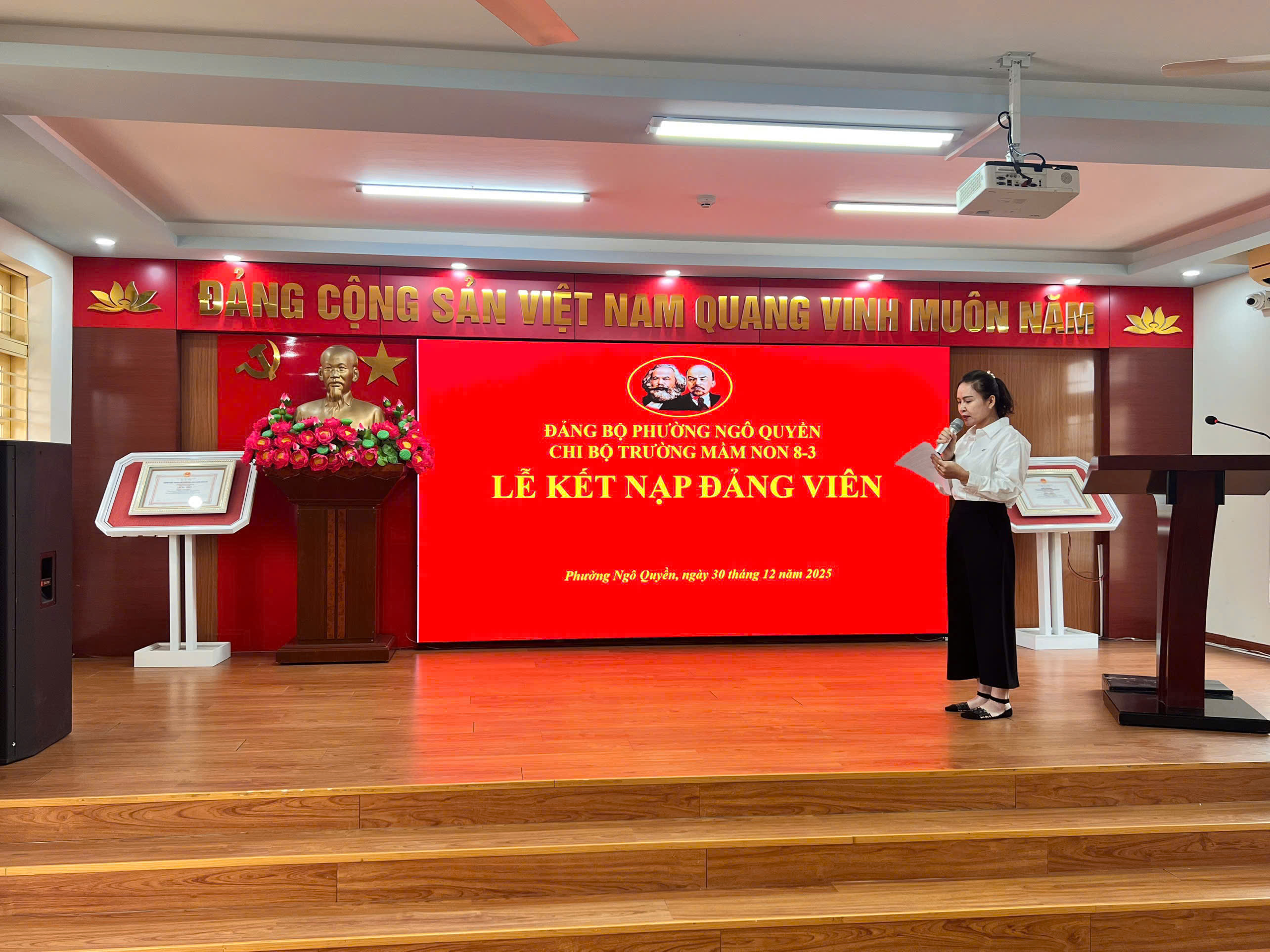 Chi bộ Trường Mầm non 8-3 long trọng tổ chức Lễ kết nạp Đảng viên cho quần chúng ưu tú đồng chí Nguyễn Thị Huệ, đánh dấu bước ngoặt quan trọng trong quá trình rèn luyện, phấn đấu và trưởng thành về tư tưởng, chính trị. Buổi lễ vinh dự được đón tiếp: