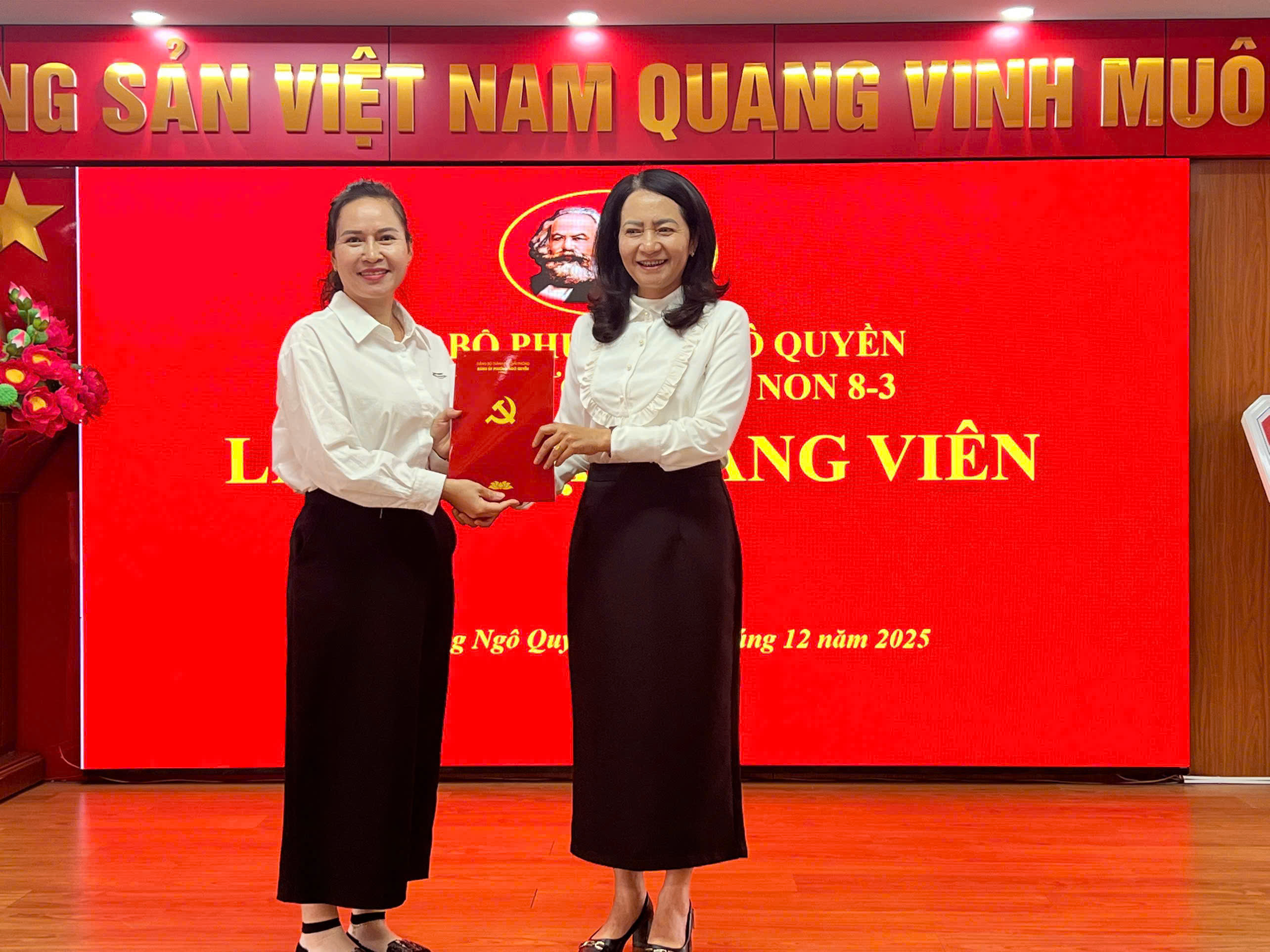 Đ/c Bí thư Chi bộ trao Quyết định kết nạp đảng viênSự hiện diện của các đồng chí lãnh đạo thể hiện sự quan tâm, chỉ đạo sâu sát của Đảng ủy đối với công tác xây dựng Đảng tại Trường Mầm non 8-3, đồng thời là nguồn động viên to lớn đối với Chi bộ và đồng chí Đảng viên mới. Buổi lễ diễn ra trong không khí trang nghiêm, đúng trình tự, thủ tục, thể hiện niềm vinh dự, tự hào và trách nhiệm của người Đảng viên Đảng Cộng sản Việt Nam. Tin tưởng rằng, trên cương vị mới, đồng chí Nguyễn Thị Huệ sẽ tiếp tục nêu cao tinh thần tiên phong, gương mẫu, hoàn thành tốt mọi nhiệm vụ được giao, góp phần xây dựng Chi bộ và nhà trường ngày càng vững mạnh.