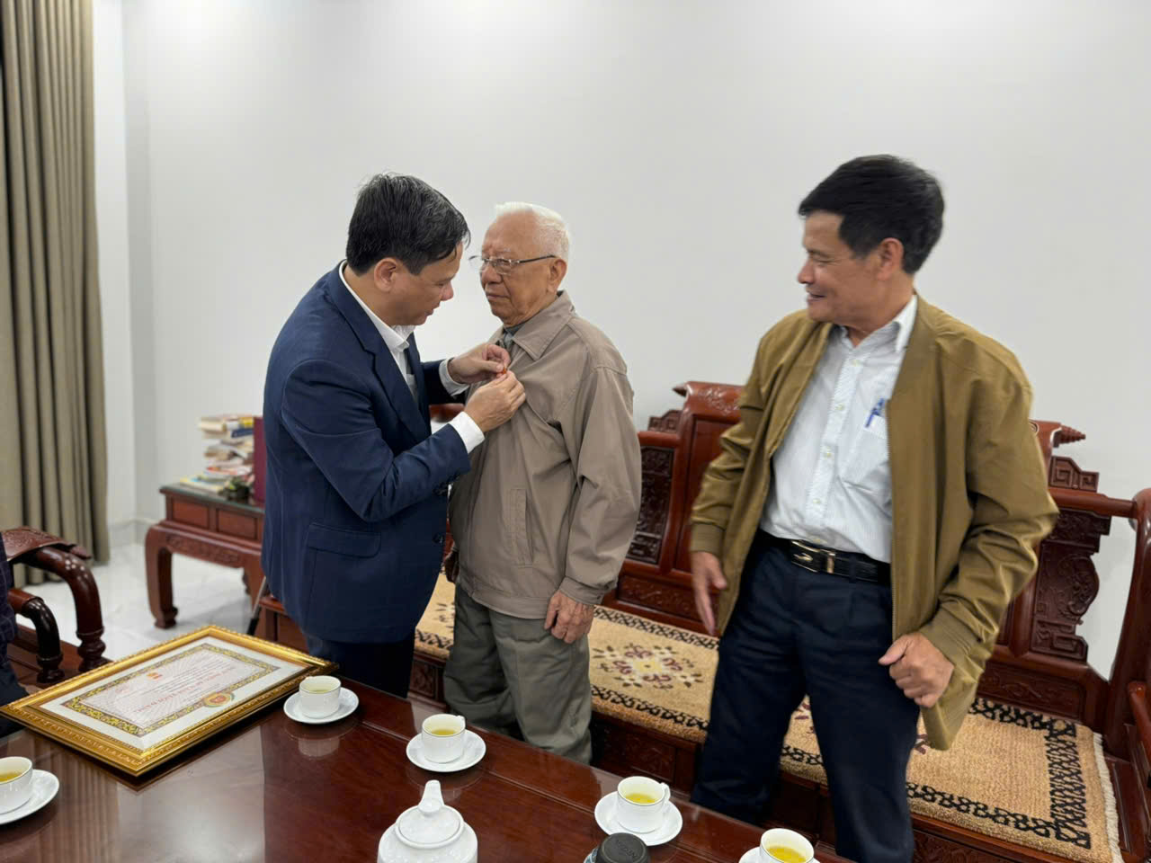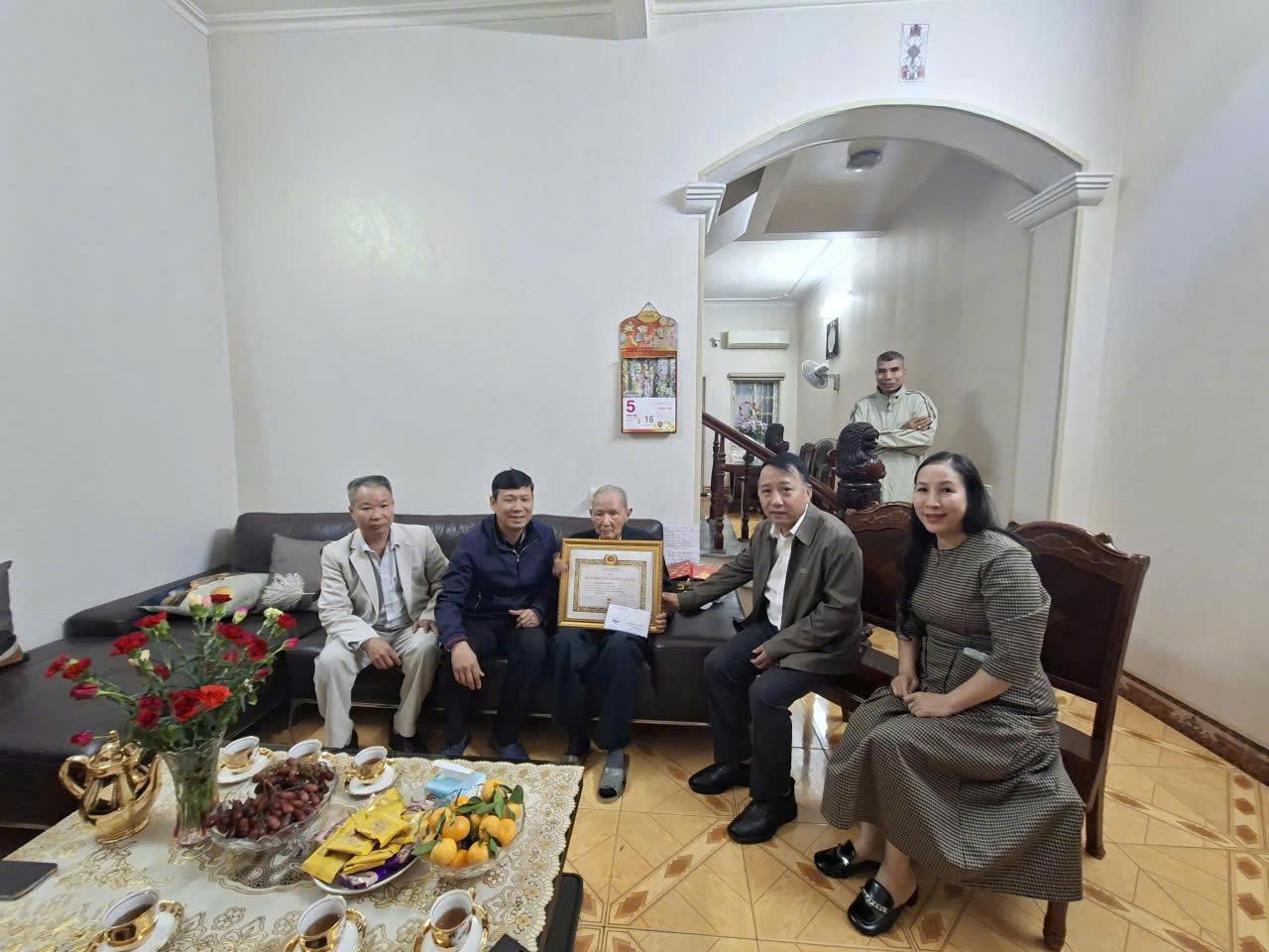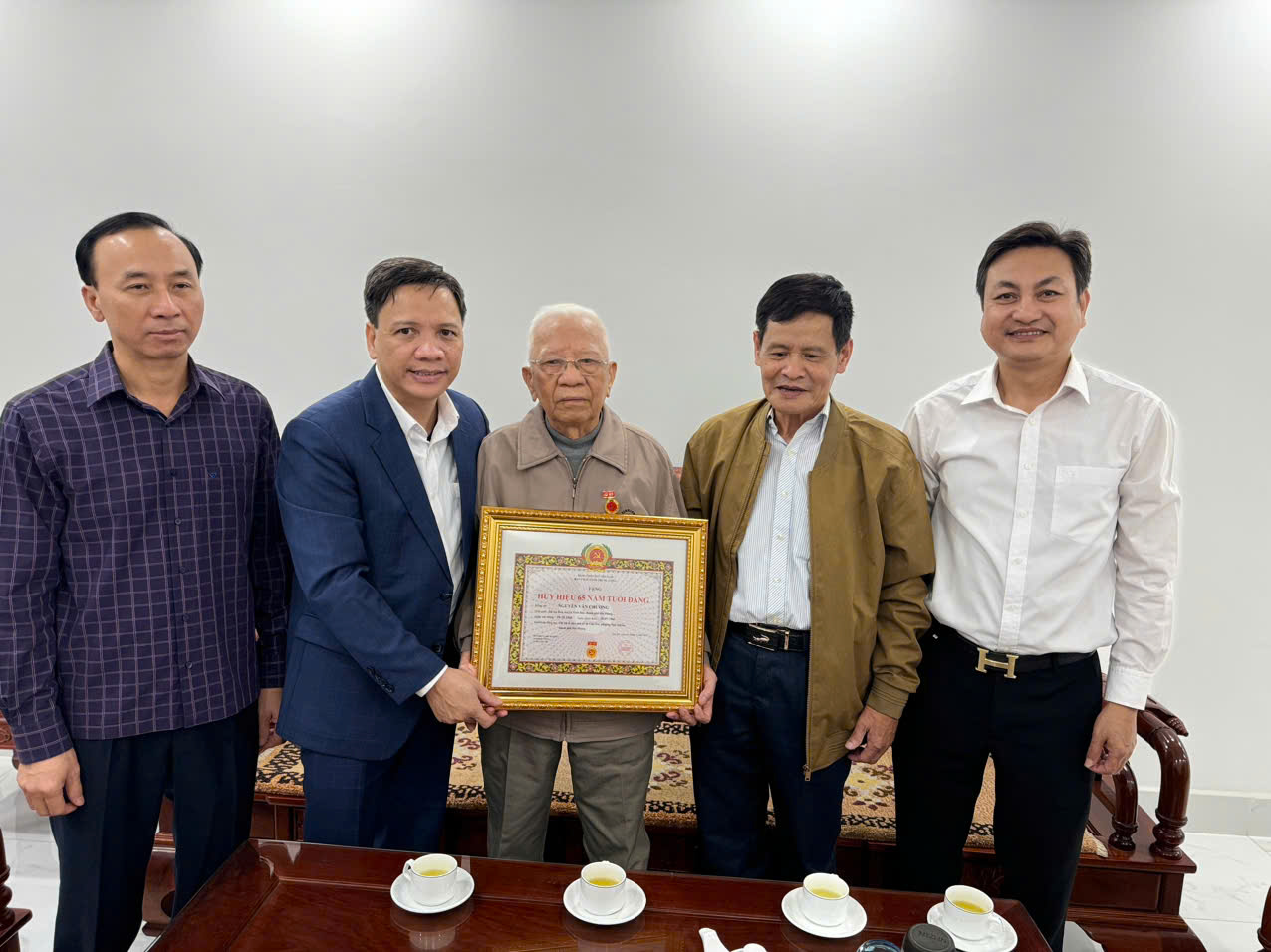 Đoàn công tác đồng chí Nguyễn Văn Thành - Phó Bí thư Thường trực Đảng ủy trao huy hiệu 75 năm cho đảng viên nguyễn Kim Hưng
