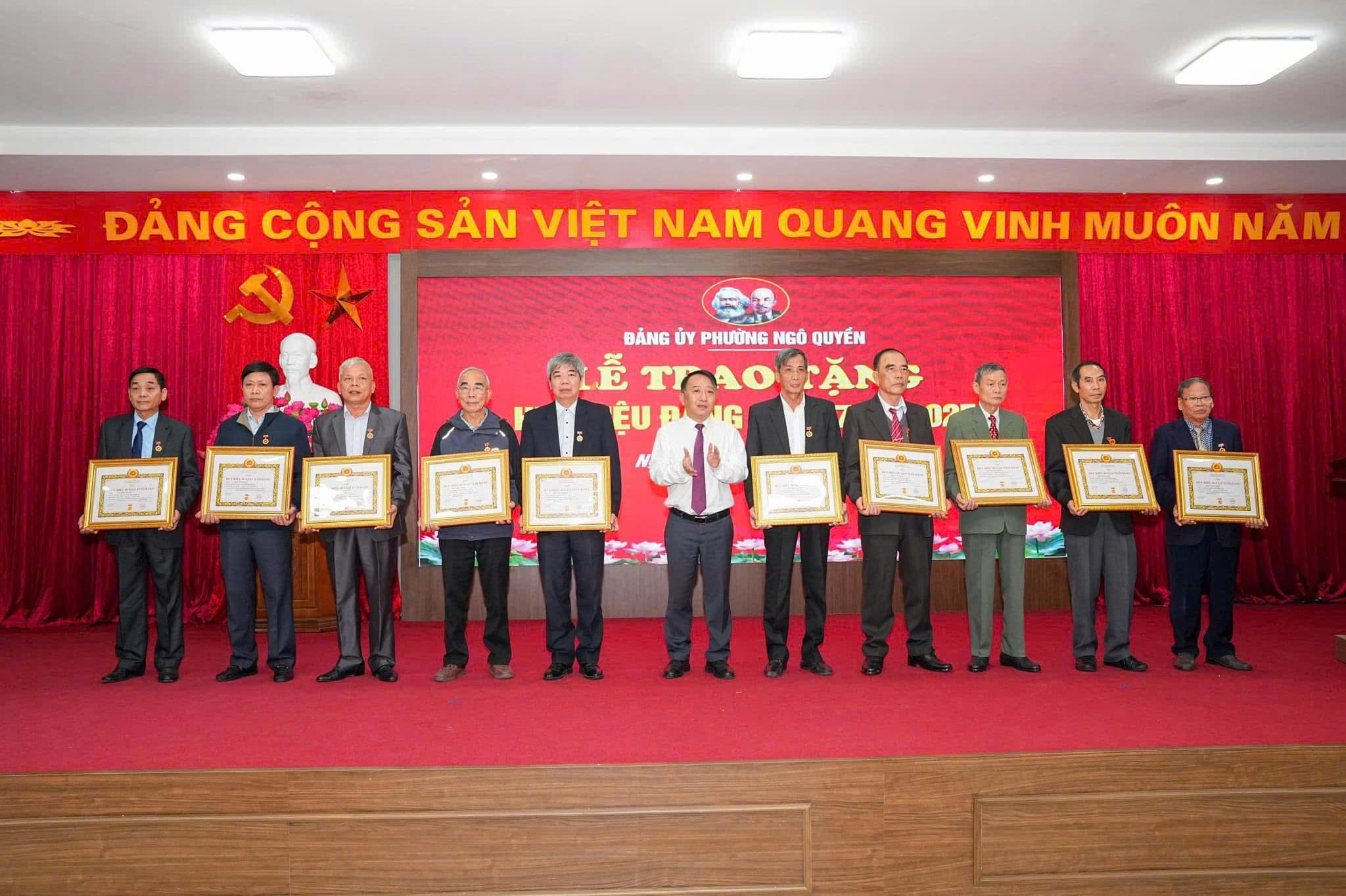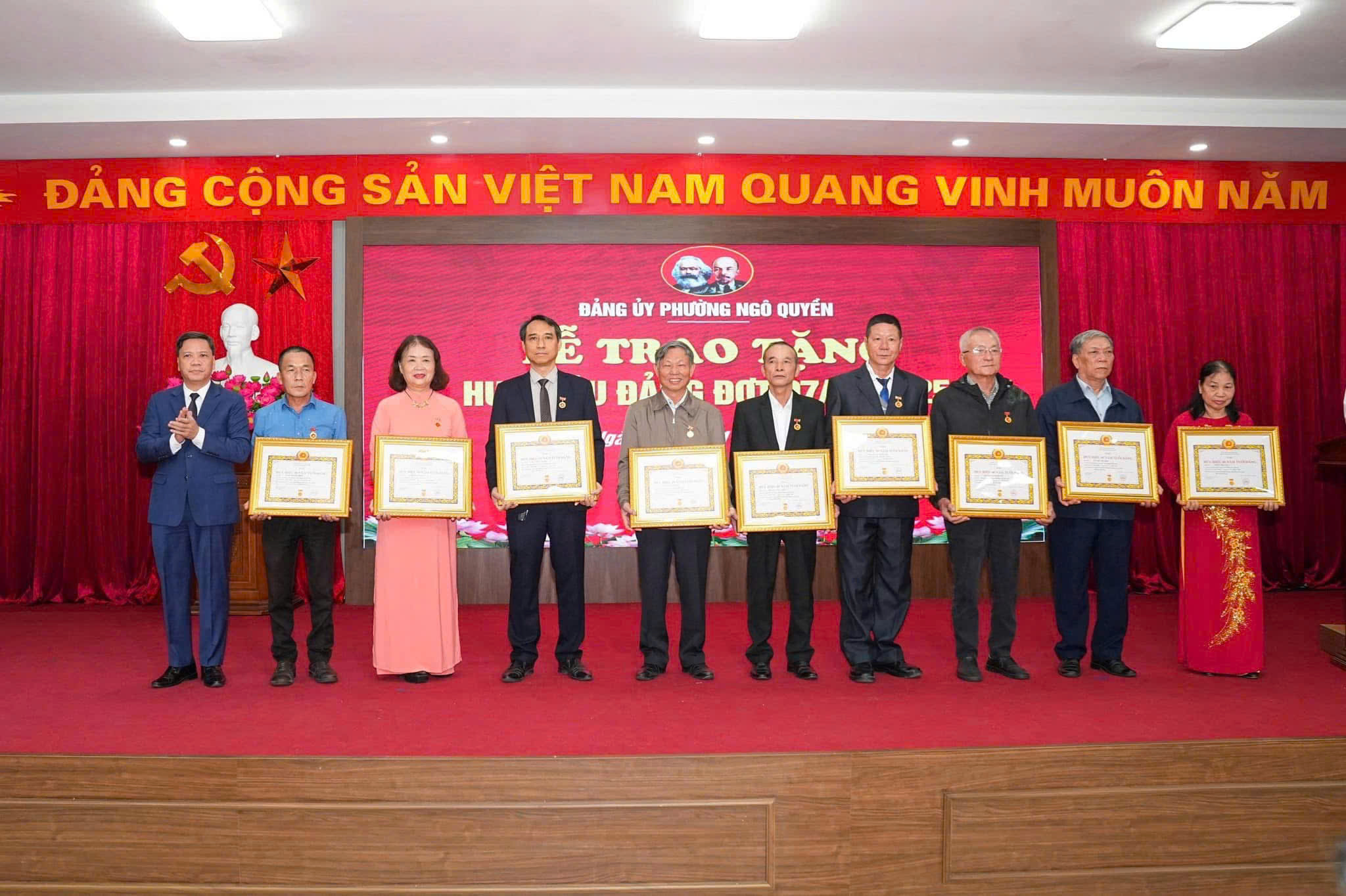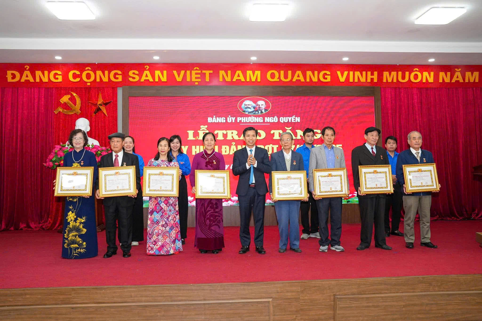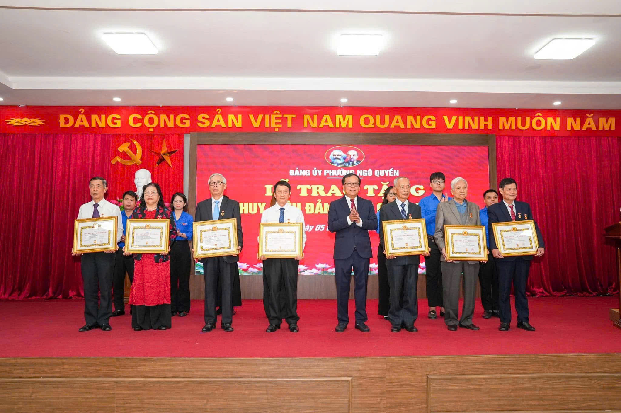 Đồng chí Nguyễn Hồng Vinh - Phó Trưởng ban Tổ chức Thành ủy trao huy hiệu ĐảngĐợt 7/11/2025, Đảng bộ Phường Ngô Quyền có 83 đảng viên được trao tặng Huy hiệu Đảng. Trong đó, có 01 đảng viên được nhận Huy hiệu 80 năm tuổi Đảng, 02 đảng viên được nhận Huy hiệu 75, 01 đảng viên được nhận Huy hiệu 70 năm tuổi Đảng năm tuổi Đảng, 01 đảng viên được nhận Huy hiệu 65 năm tuổi Đảng, 09 đảng viên được tặng Huy hiệu 60 năm tuổi Đảng, 03 đảng viên được tặng Huy hiệu 55 năm tuổi Đảng, 06 đảng viên được tặng Huy hiệu 50 năm tuổi Đảng, 15 đảng viên được tặng Huy hiệu 45 năm tuổi Đảng, 29 đảng viên được tặng Huy hiệu 40 năm tuổi Đảng, 16 đảng viên được tặng Huy hiệu 30 năm tuổi Đảng.