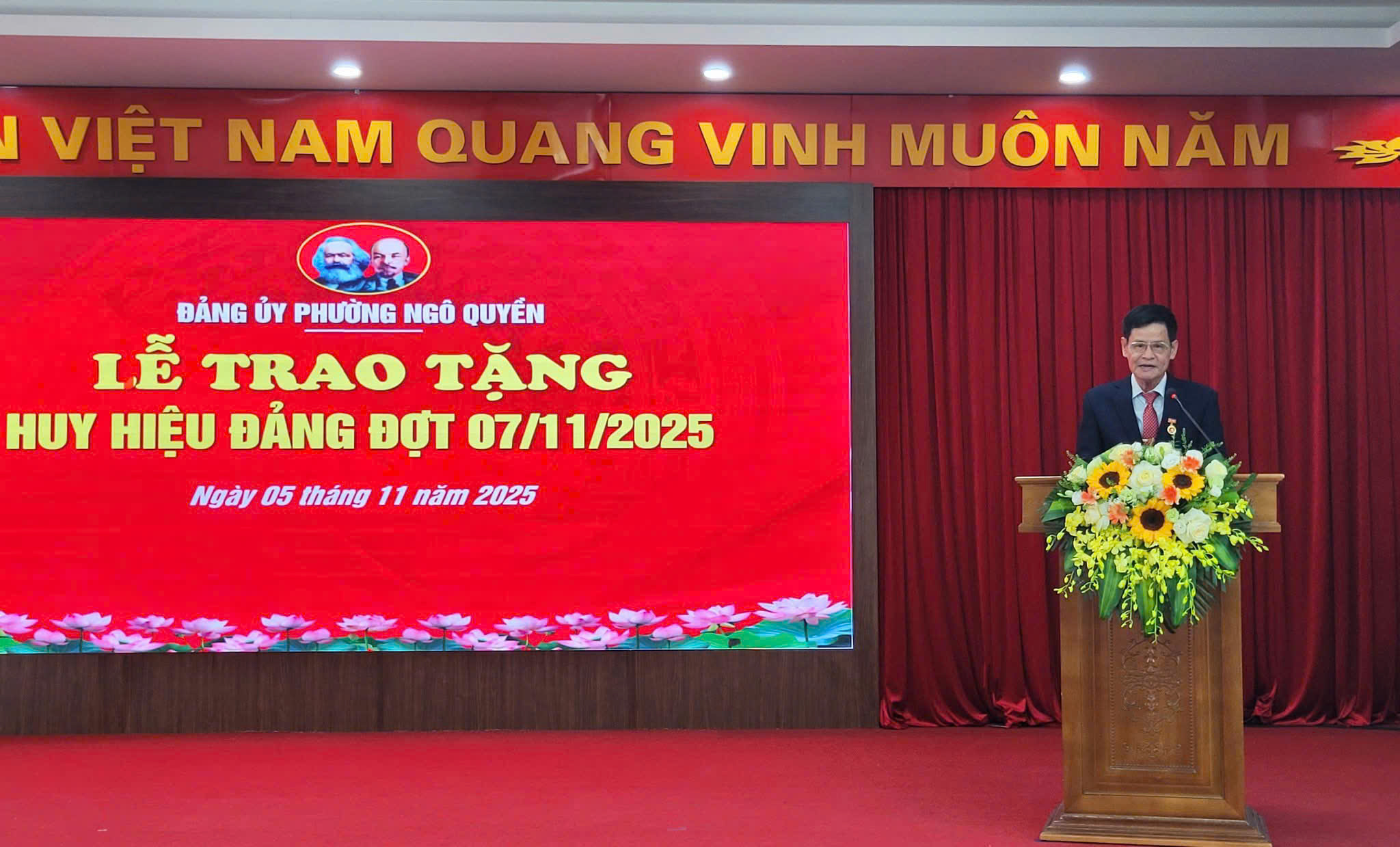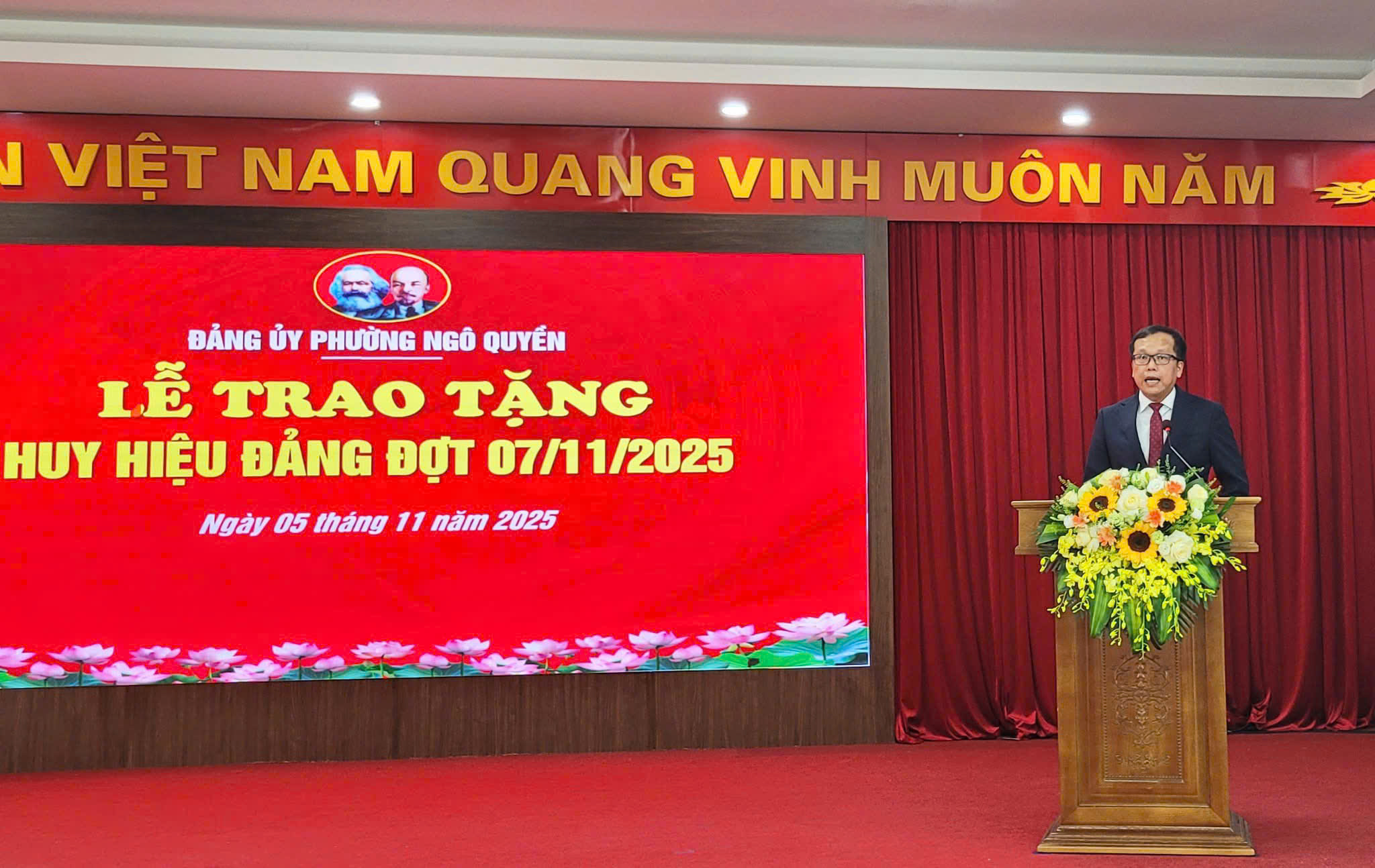 Sáng ngày 05/11/2025, Đảng ủy Phường Ngô Quyền, thành phố Hải Phòng tổ chức Lễ trao tặng Huy hiệu Đảng đợt 7/11/2025 cho các đảng viên thuộc Đảng bộ phường. Dự buổi Lễ có các đồng chí: Phạm Văn Thép, Ủy viên Ban Thường vụ Thành ủy, Giám đốc Sở Khoa học và Công nghệ thành phố, phụ trách Đảng bộ phường; Nguyễn Hồng Vinh - Phó Trưởng ban Tổ chức Thành ủy; Cáp Trọng Tuấn - Bí thư Đảng ủy, Chủ tịch HĐND phường; Nguyễn Quốc Thái - Phó Bí thư Đảng ủy, Chủ tịch UBND phường; Nguyễn Văn Thành - Phó Bí thư Thường trực Đảng ủy phường.