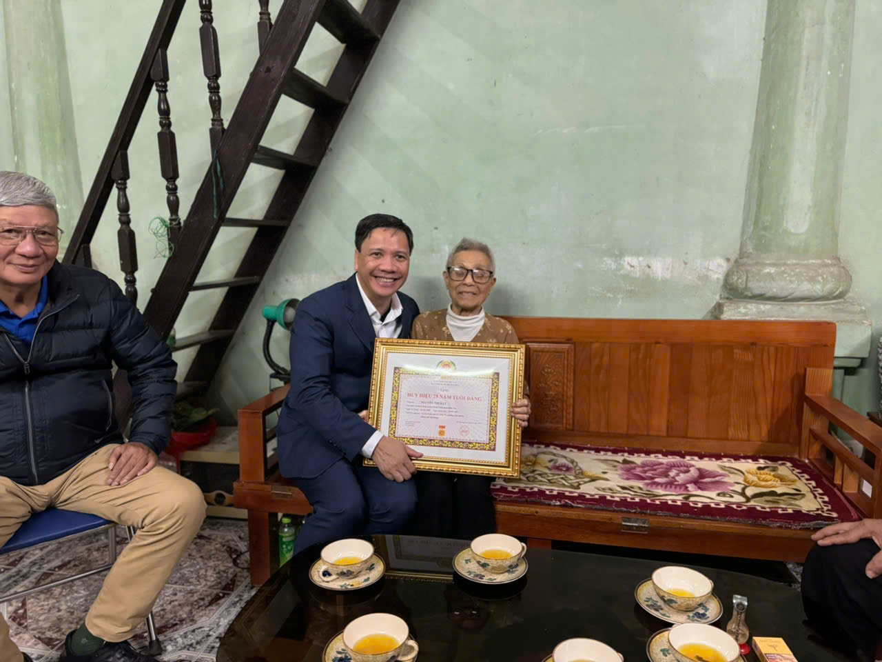 Đoàn công tác đồng chí Nguyễn Văn Thành - Phó Bí thư Thường trực Đảng ủy trao huy hiệu 80 năm cho đảng viên Ngô Thị Xuân