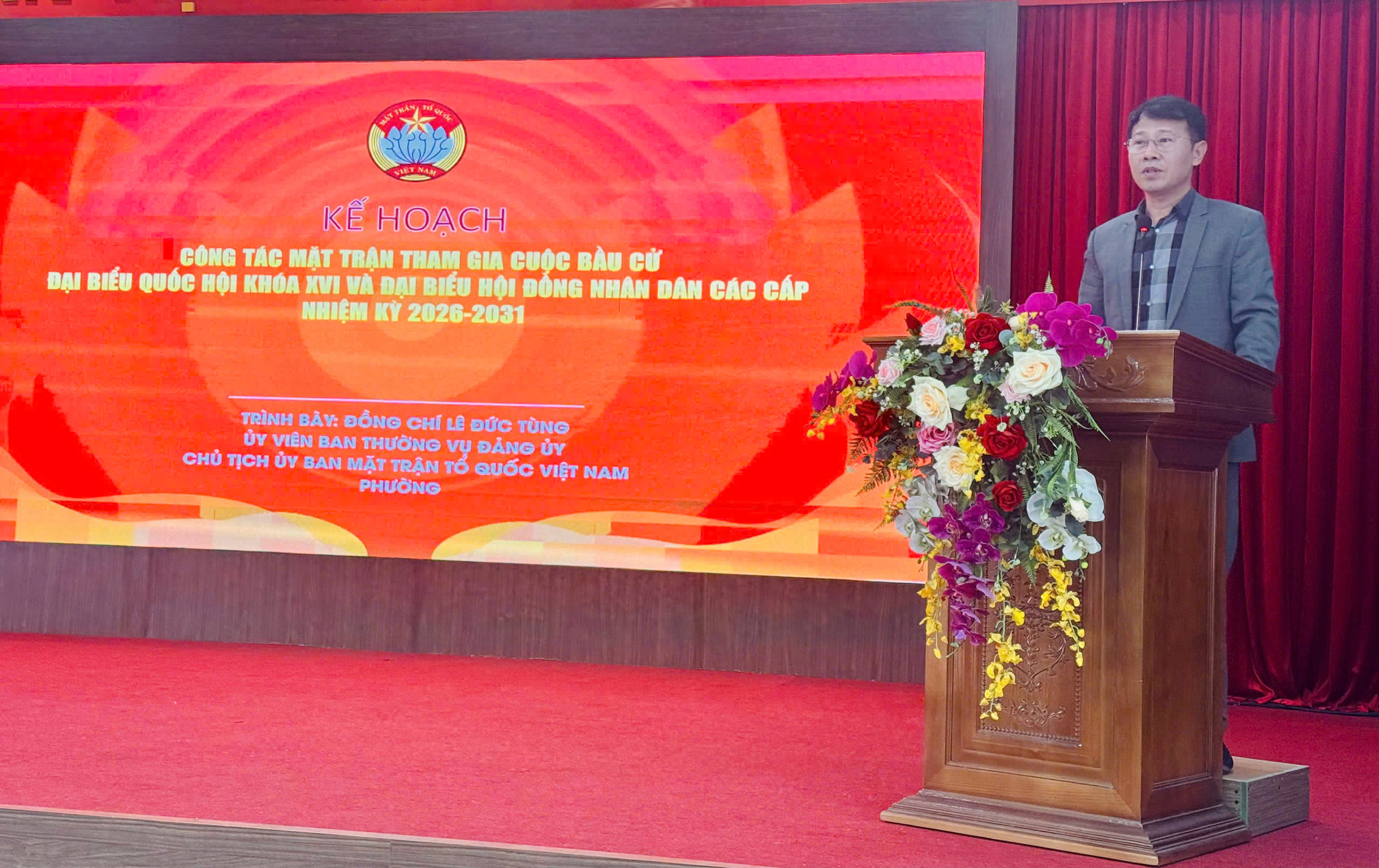 Đ/c Lê Đức Tùng - Chủ tịch UB MTTQ Việt Nam phường triển khai kế hoạchDự Hội nghị có các đồng chí: Cáp Trọng Tuấn - Bí thư Đảng ủy, Chủ tịch HĐND phường; Nguyễn Quốc Thái - Phó Bí thư Đảng ủy, Chủ tịch UBND phường; Nguyễn Văn Thành - Phó Bí thư Thường trực Đảng ủy; lãnh đạo HĐND, UBND, Ủy ban MTTQ Việt Nam phường; các đồng chí thành viên Ban Chỉ đạo Đảng ủy về công tác bầu cử; Ủy ban bầu cử phường; các đồng chí cán bộ, chuyên viên được phân công nhiệm vụ về công tác bầu cử: Văn phòng Đảng ủy, Ban Xây dựng Đảng, Ủy ban Kiểm tra Đảng ủy; Cơ quan Ủy ban MTTQ Việt Nam phường, Văn phòng HĐND & UBND, Phòng Văn hóa - Xã hội phường; các đồng chí Bí thư, Tổ trưởng, Trưởng ban Công tác mặt trận Tổ dân phố.