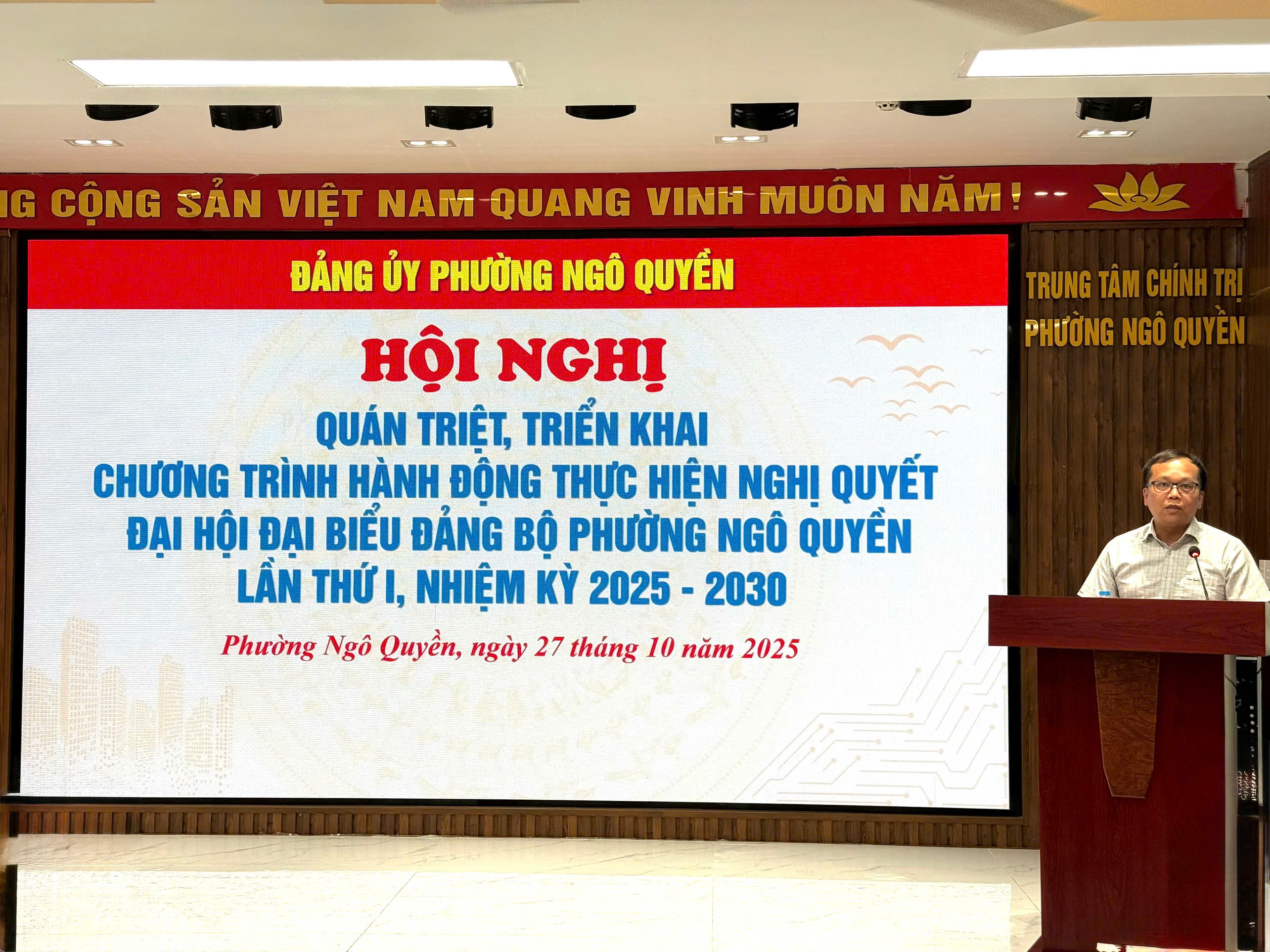 Tiếp theo chương trình hội nghị, đồng chí Cáp Trọng Tuấn - Bí thư Đảng uỷ, Chủ tịch HĐND phường đã thay mặt Ban Chấp hành Đảng bộ phường đã quán triệt, triển khai Chương trình hành động thực hiện Nghị quyết Đại hội Đại biểu Đảng bộ Phường Ngô Quyền lần thứ I, nhiệm kỳ 2025-2030.
