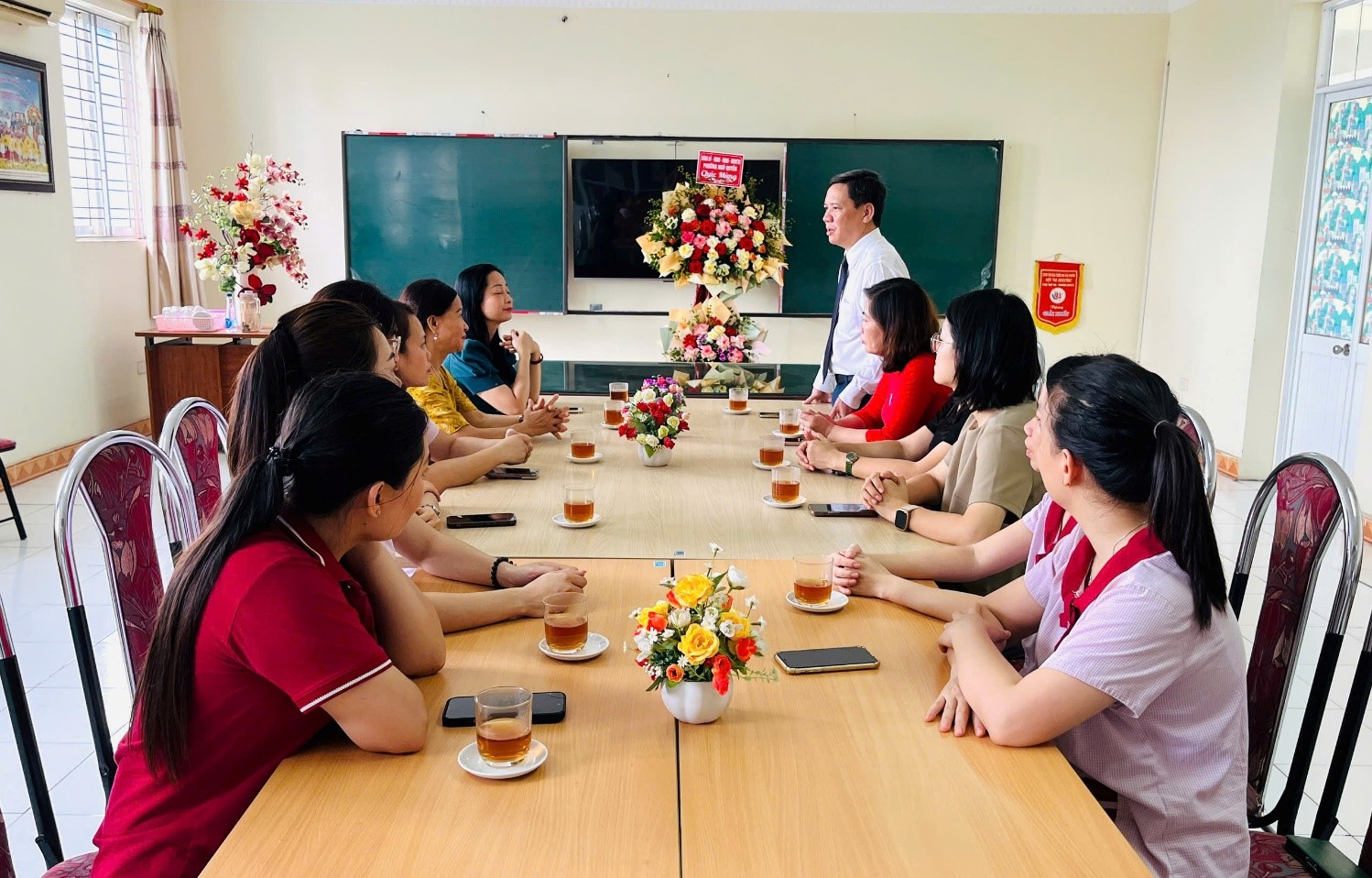 Phát biểu với Nhà trường nhân dịp kỷ niệm, đồng chí Nguyễn Quốc Thái – Phó Bí thư Đảng uỷ, Chủ tịch UBND phường chúc mừng những thành tích Trường Mầm non Hải Viên đã đạt được trong những năm qua.