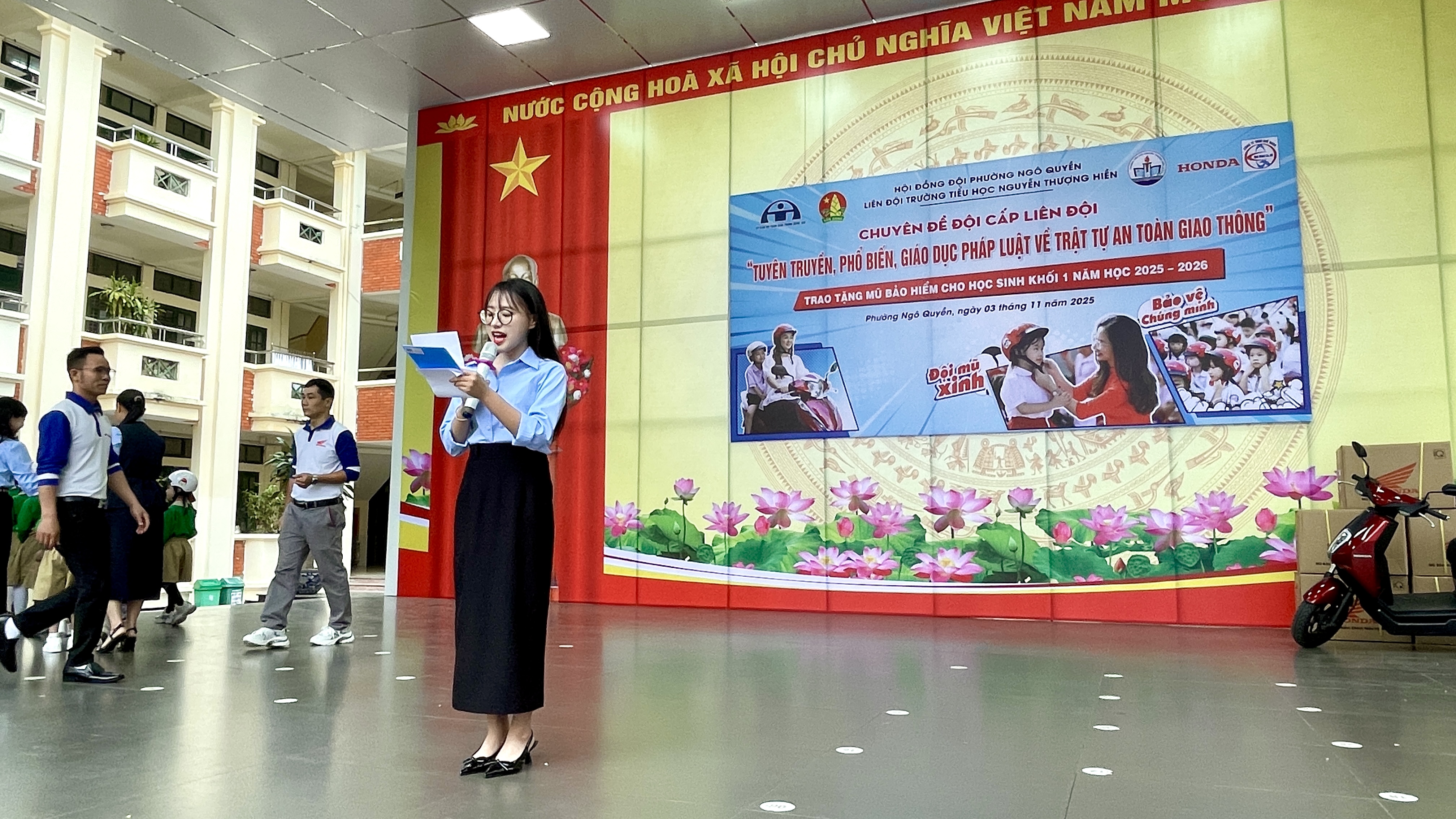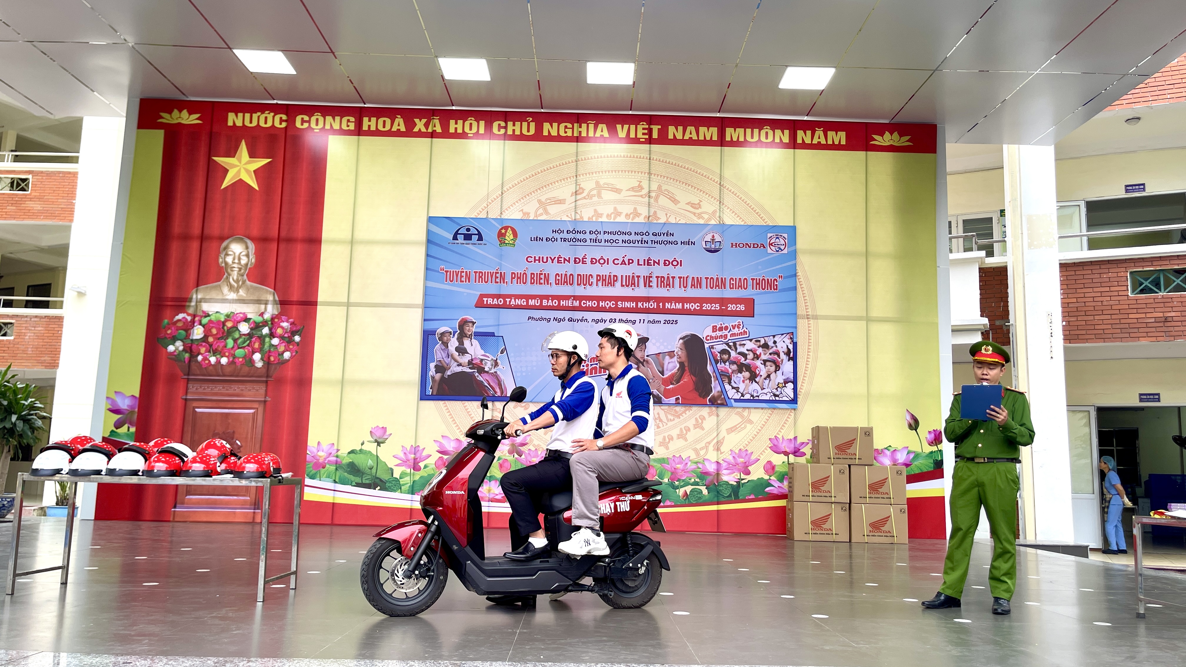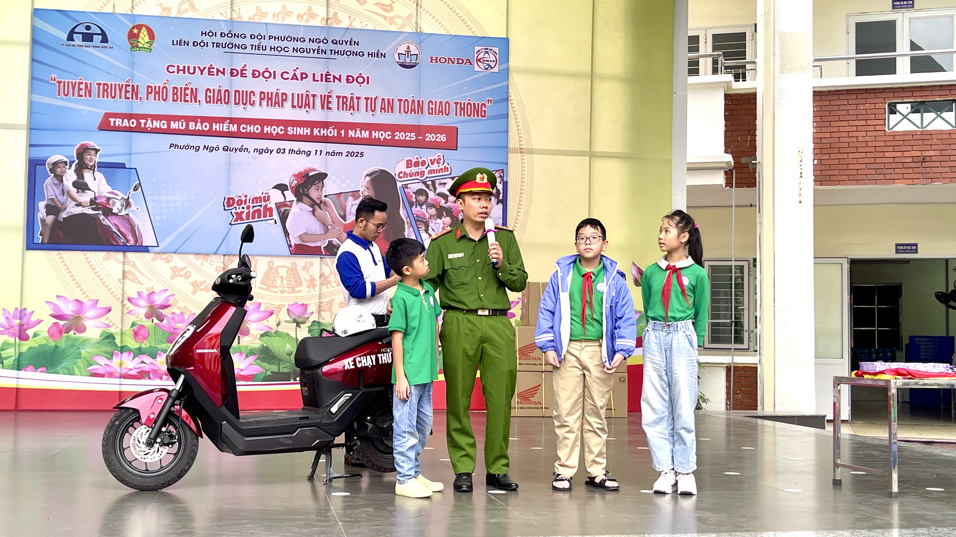 Thực hiện Kế hoạch phối hợp số 76 ngày 12/01/2023 giữa Công an thành phố Hải Phòng và Sở Giáo dục và Đào tạo Hải Phòng về tăng cường tuyên truyền, phổ biến, giáo dục pháp luật về trật tự an toàn giao thông trong các cơ sở giáo dục, sáng ngày 03/11/2025, Liên đội Trường Tiểu học Nguyễn Thượng Hiền tổ chức Chuyên đề cấp Liên đội: “Tuyên truyền, phổ biến giáo dục pháp luật về trật tự an toàn giao thông và trao tặng mũ bảo hiểm cho học sinh khối 1”.