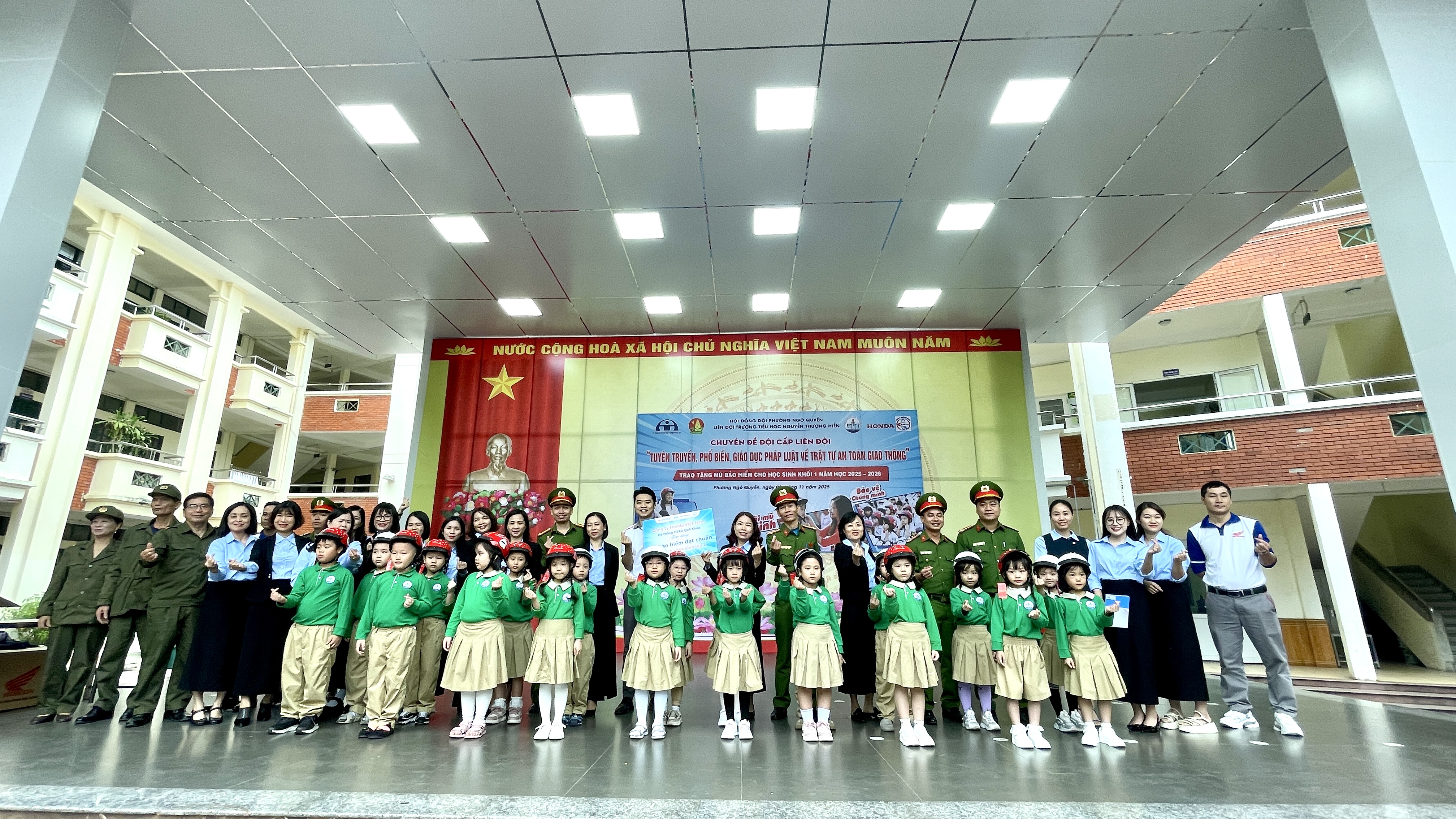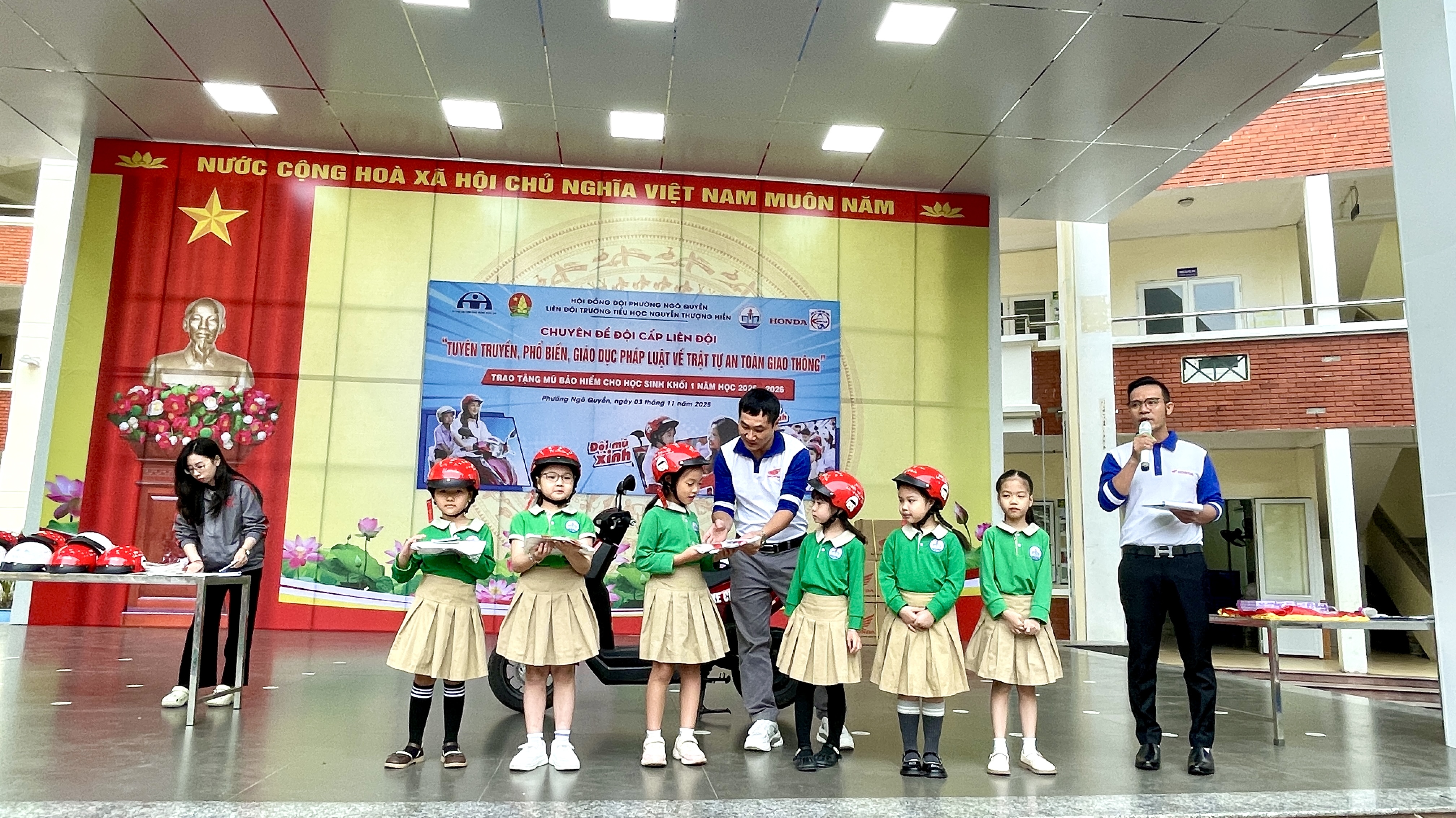 Đặc biệt, trong chương trình, Liên đội phối hợp với đơn vị tài trợ Công ty TNHH Quế Khoa đã trao tặng mũ bảo hiểm đạt chuẩn cho 100% học sinh khối 1. Đây là món quà thiết thực và ý nghĩa, góp phần bảo đảm an toàn cho các em, đồng thời lan tỏa thông điệp: “An toàn giao thông là hạnh phúc của mọi nhà.”