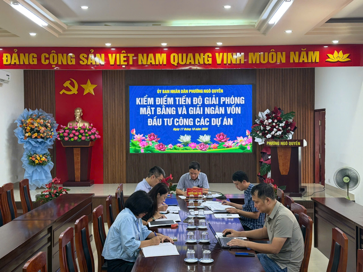 Ngày 17/10/2025, Ủy ban nhân dân Phường Ngô Quyền họp kiểm điểm tiến độ giải phóng mặt bằng và giải ngân vốn đầu tư công thực hiện các dự án trên địa bàn. Chủ trì: đồng chí Nguyễn Quốc Thái - Chủ tịch UBND phường. Tham dự cuộc họp có: Giám đốc Ban Quản lý dự án khu vực Ngô Quyền; Trưởng, phó, chuyên viên phụ trách các phòng: Kinh tế, Hạ tầng và Đô thị, Văn phòng HĐND và UBND phường.