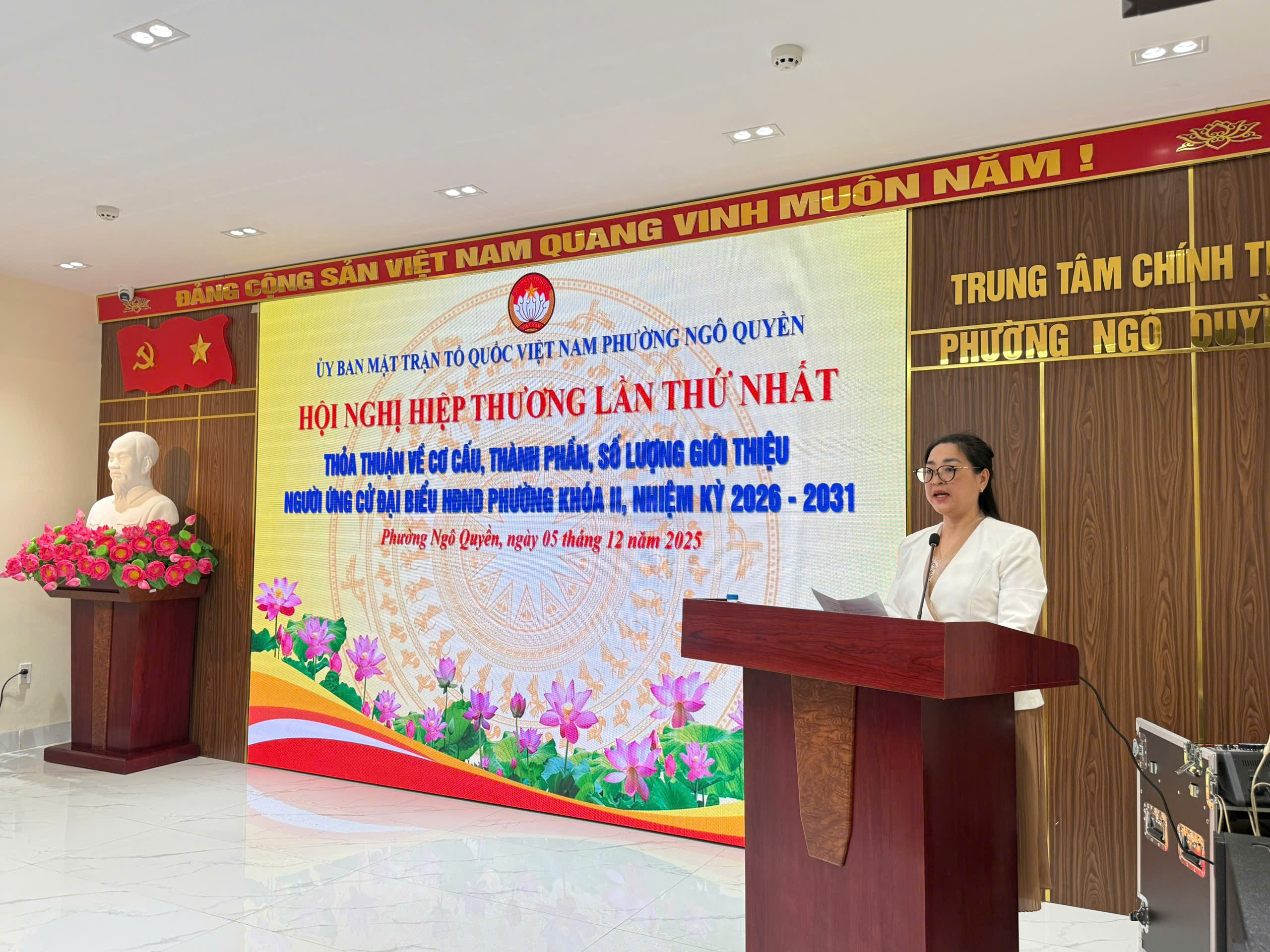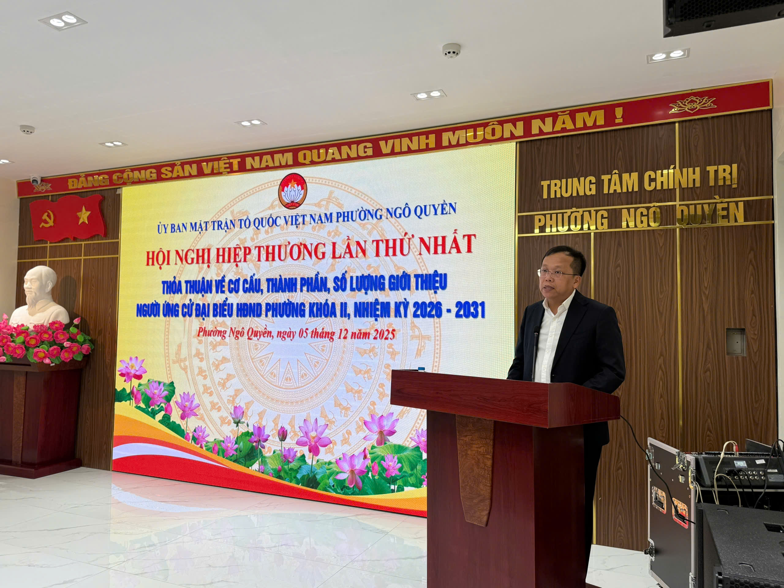 Ngày 05/12/2025, UBMTTQ Việt Nam Phường Ngô Quyền tổ chức Hội nghị Hiệp thương lần thứ 1, thỏa thuận về cơ cấu, thành phần, số lượng giới thiệu người ứng cử đại biểu HĐND  phường khóa II, nhiệm kỳ 2026 - 2031.