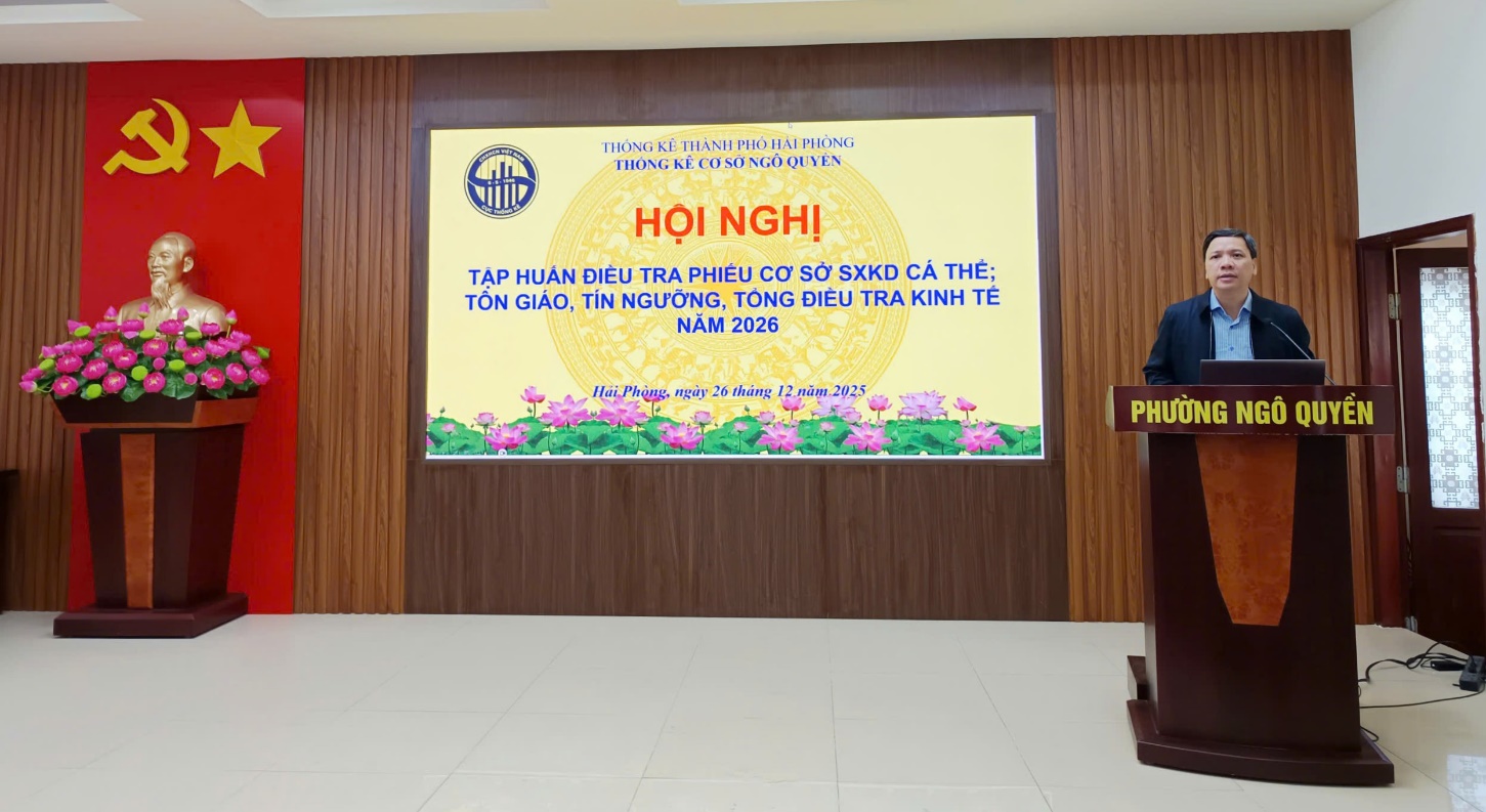 Đồng chí Nguyễn Quốc Thái – Phó Bí thư Đảng ủy, Chủ tịch UBND Phường Ngô Quyền phát biểu chỉ đạo Hội nghịTrong thời gian tới, UBND Phường Ngô Quyền đề nghị Chủ các cơ sở SXKD và Nhân dân trên địa bàn phối hợp cung cấp thông tin đầy đủ, chính xác để góp phần thành công của cuộc Tổng điều tra kinh tế năm 2026, là cơ sở để xây dựng kế hoạch, chính sách phát triển kinh tế - xã hội của cả nước và địa phương./.